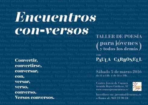 Encuentros con-versos Publicado el 25/02/201603/03/2016 por Paula Carbonell Publicado en General Por problemas ajenos a nuestra voluntad el talller se aplaza al sábado día 9 de abril. Os espero.